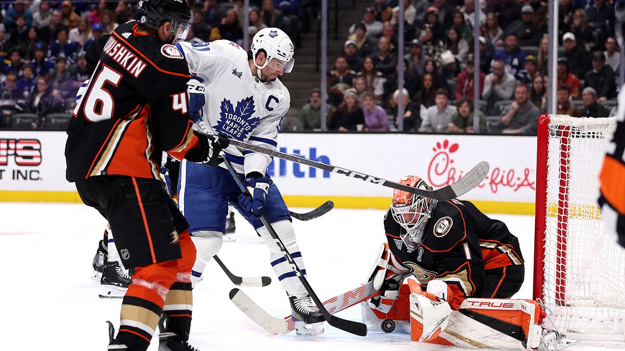 Lukas Dostal (1) of the Anaheim Ducks blocks a shot on goal by John Tavares (91) of the Toronto Maple Leafs during the third period of a game at Honda Center Jan. 3, 2024, in Anaheim, Calif. (Sean M. Haffey/Getty Images)