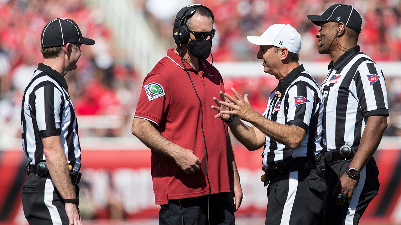Nick Rolovich, head coach of the Washington State Cougars, talks with officials during a game against the Utah Utes Sept. 25, 2021, at Rice-Eccles Stadium in Salt Lake City, Utah. (Chris Gardner/Getty Images)