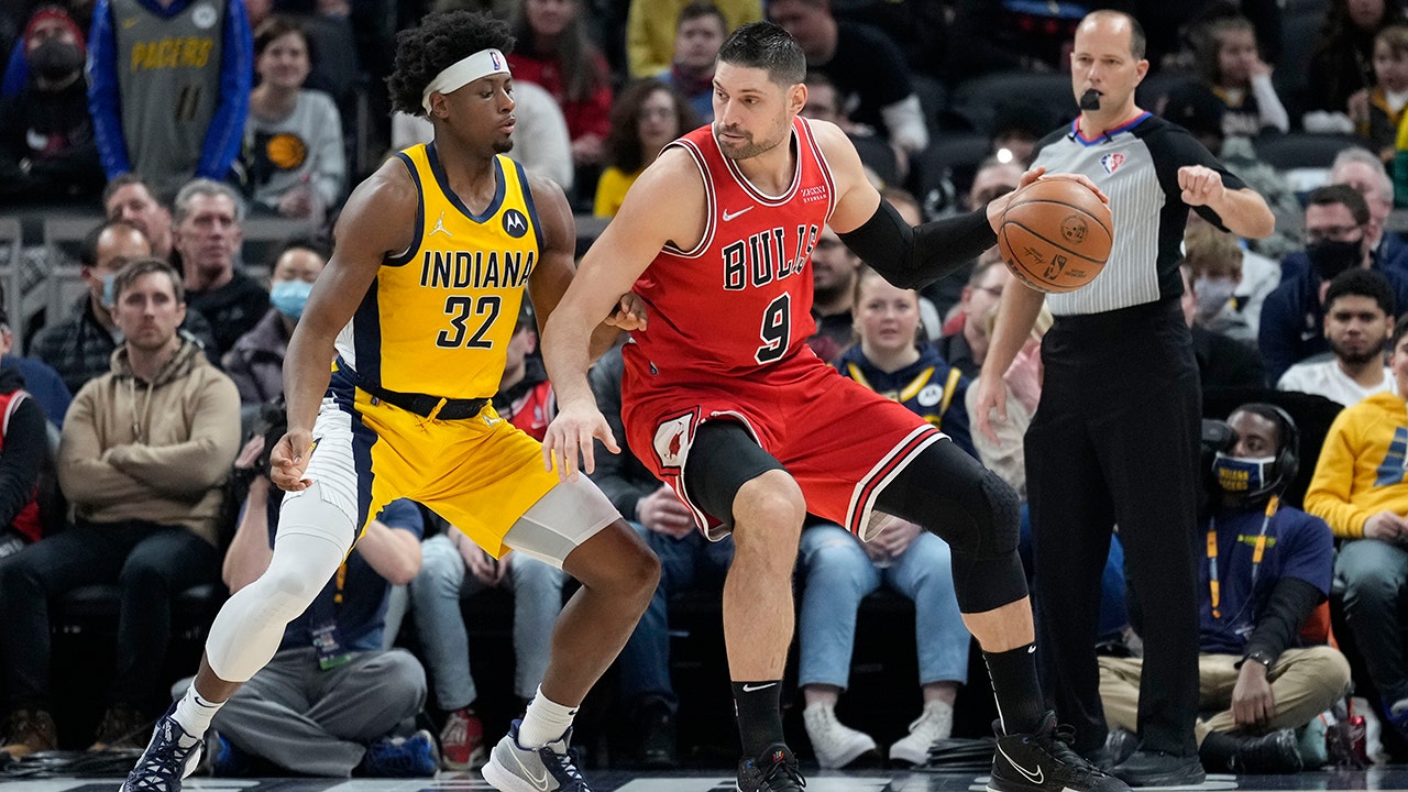 Chicago Bulls center Nikola Vucevic (9) moves to the basket in front of Indiana Pacers guard Terry Taylor (32) during the first half of an NBA basketball game in Indianapolis, Friday, Feb. 4, 2022. (AP Photo/AJ Mast)