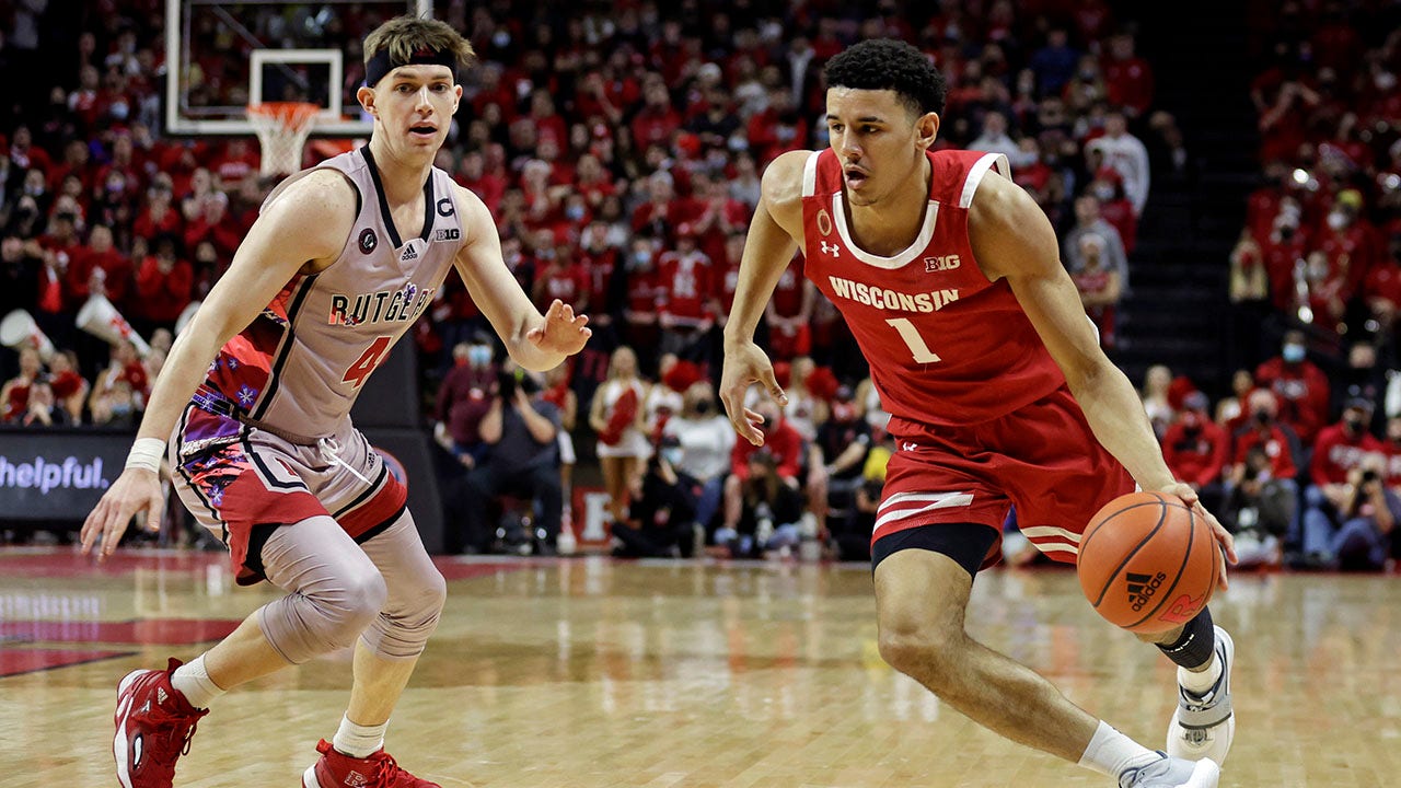 Wisconsin guard Johnny Davis (1) drives past Rutgers guard Paul Mulcahy during the first half of an NCAA college basketball game Saturday, Feb. 26, 2022, in Piscataway, N.J. (AP Photo/Adam Hunger)