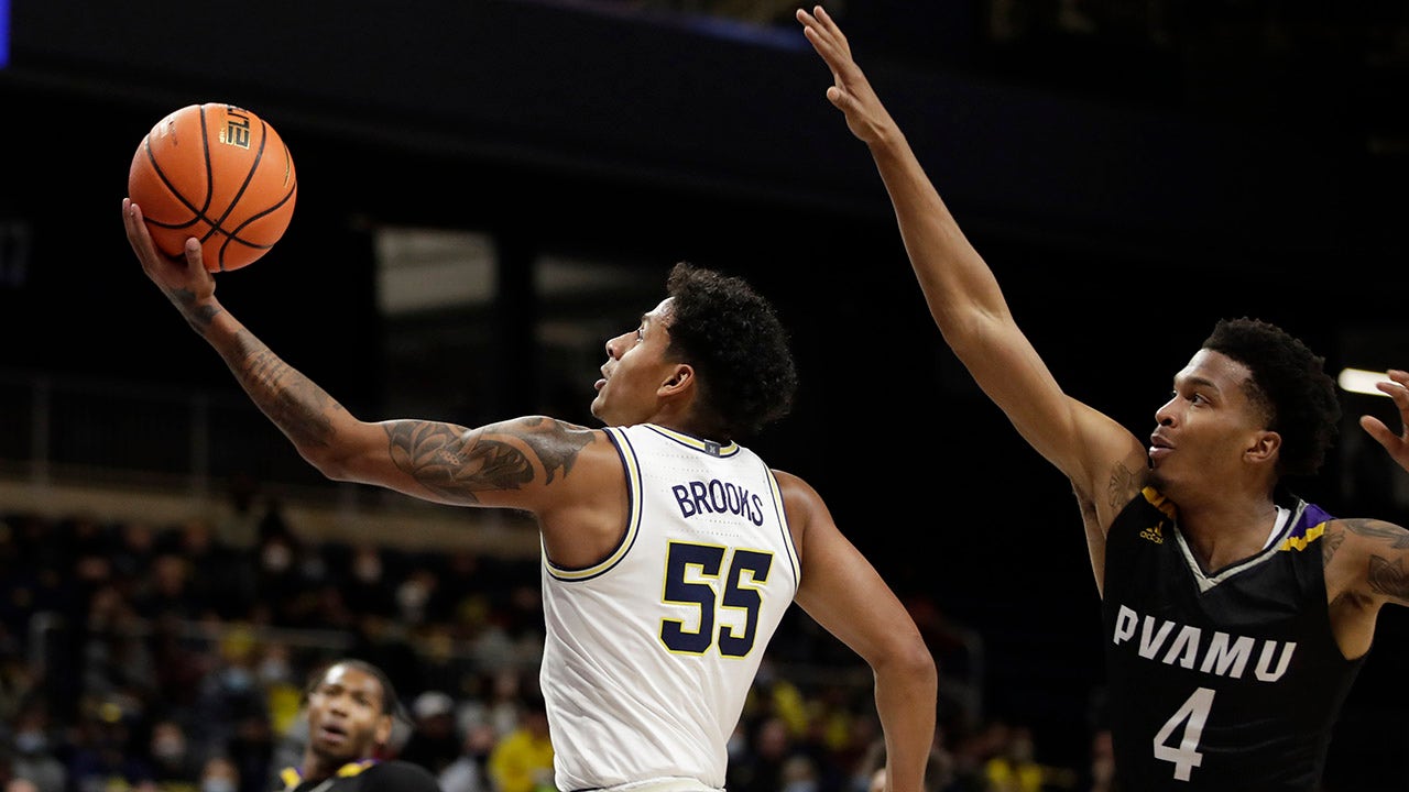 Eli Brooks scored 15 points, Caleb Houstan added 13 points, and No. 6 Michigan cruised Saturday night to a 77-49 victory over Prairie View A&M.