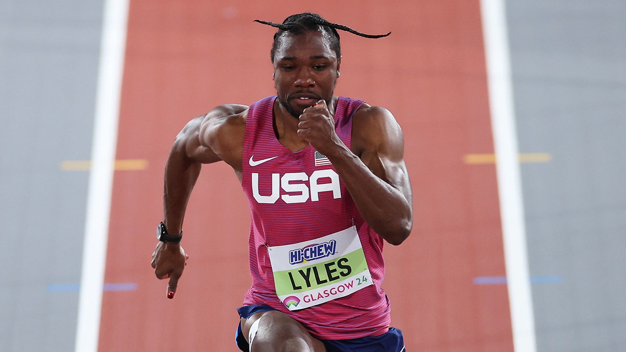Noah Lyles of the U.S. competes in the men's 60-meter dash at the World Athletics Indoor Championships Glasgow 2024 at Emirates Arena March 1, 2024, in Glasgow, Scotland. (Michael Steele/Getty Images)