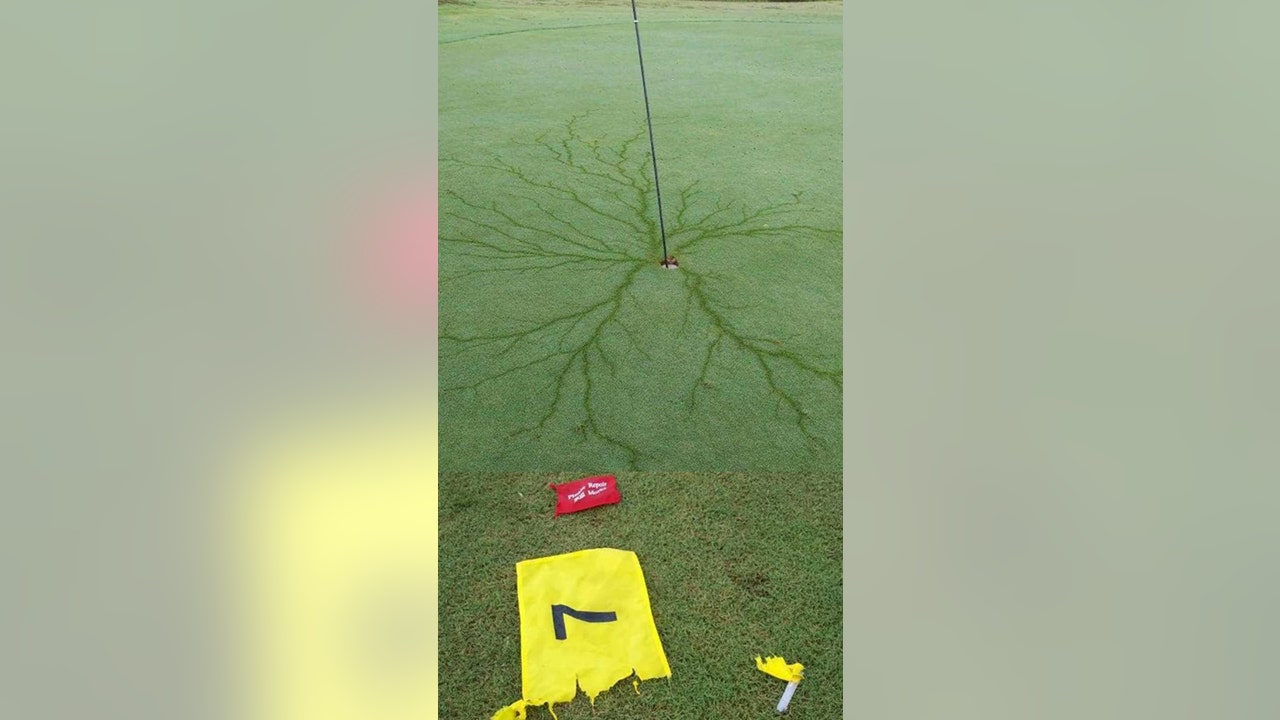Workers found shards of plastic from the flagstick all over the green and the grass scorched in a fern-like branching stretching six to seven feet, the paper reported.