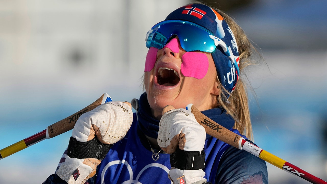 Norway's Therese Johaug react after a gold medal finish during the women's 7.5km + 7.5km skiathlon cross-country skiing competition at the 2022 Winter Olympics, Saturday, Feb. 5, 2022, in Zhangjiakou, China. (AP Photo/Aaron Favila)