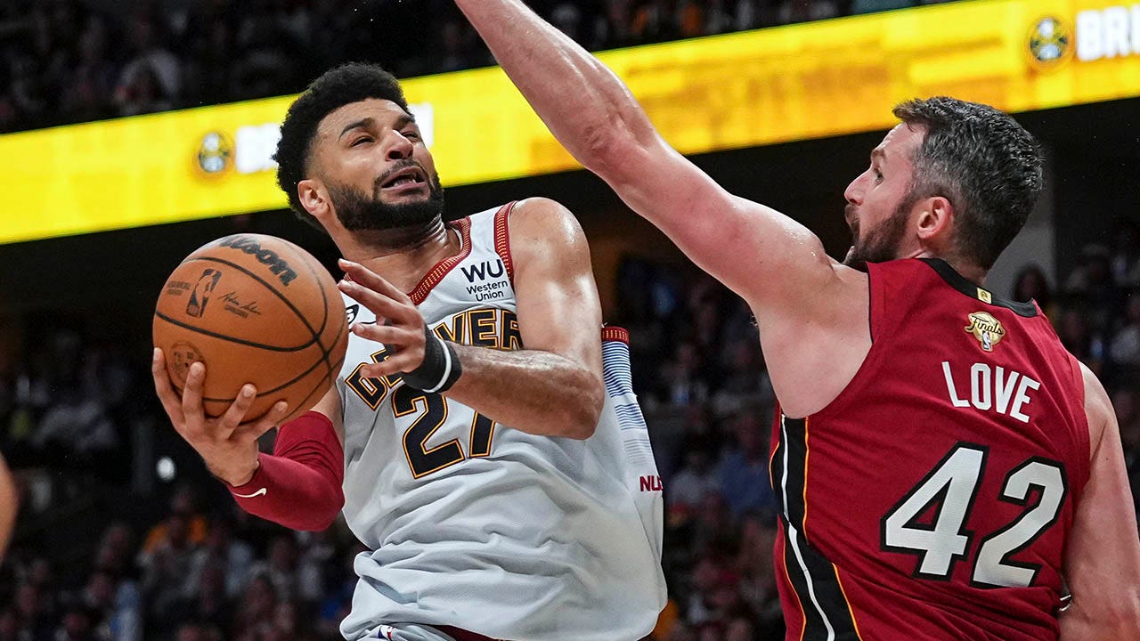 Nuggets guard Jamal Murray shoots while defended by Miami Heat forward Kevin Love, Monday, June 12, 2023, in Denver. (AP Photo/Jack Dempsey)