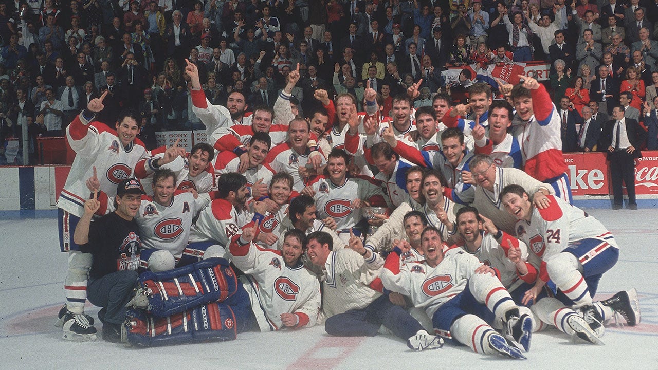 The Montreal Canadiens celebrate after defeating the Los Angeles Kings in the Stanley Cup Final at the Forum in Montreal on June 9, 1993. (Bruce Bennett Studios via Getty Images Studios/Getty Images)