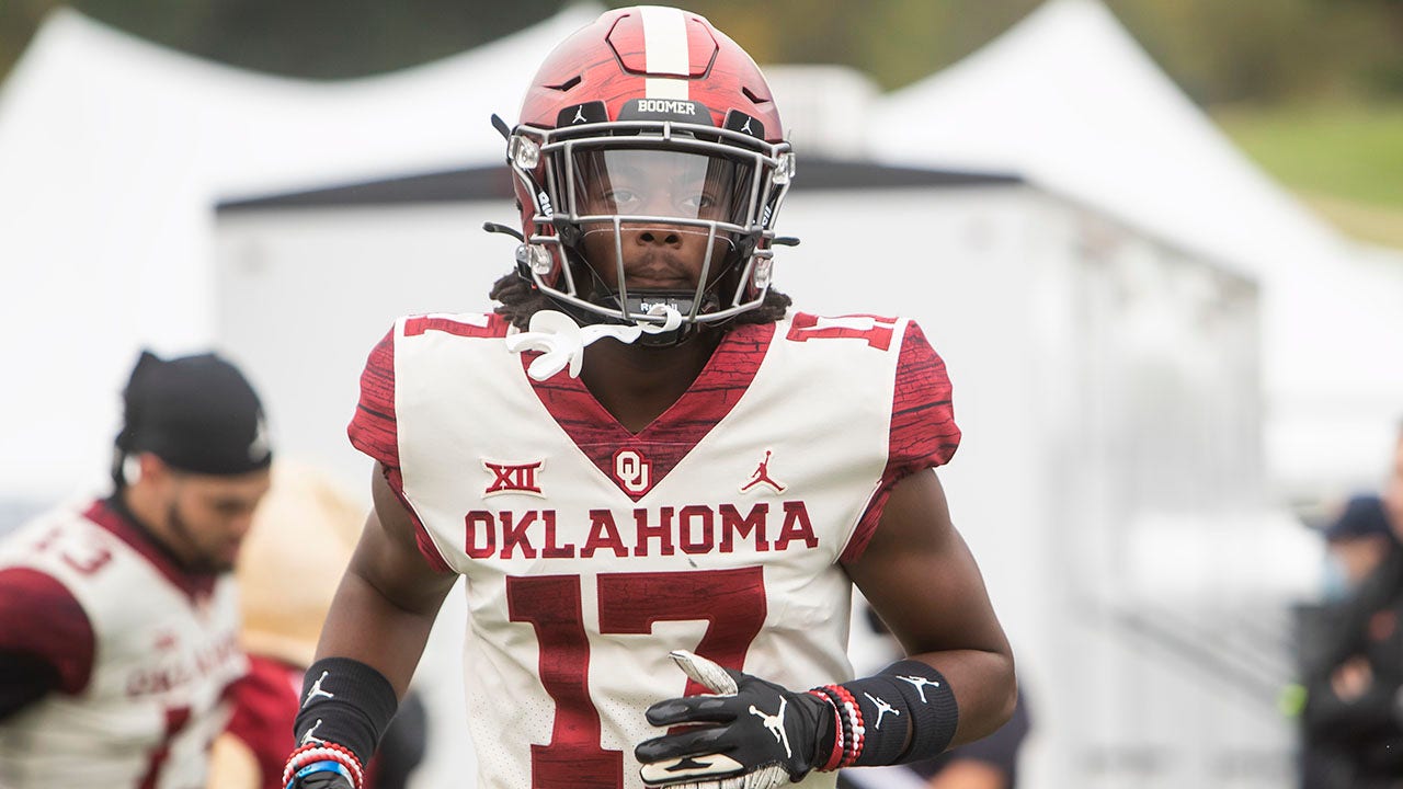 Oklahoma Sooners defensive back Damond Harmon jogs onto the field prior to a game against the Kansas Jayhawks Oct. 23, 2021, at Memorial Stadium in Lawrence, Kan. (Nick Tre. Smith/Icon Sportswire via Getty Images)