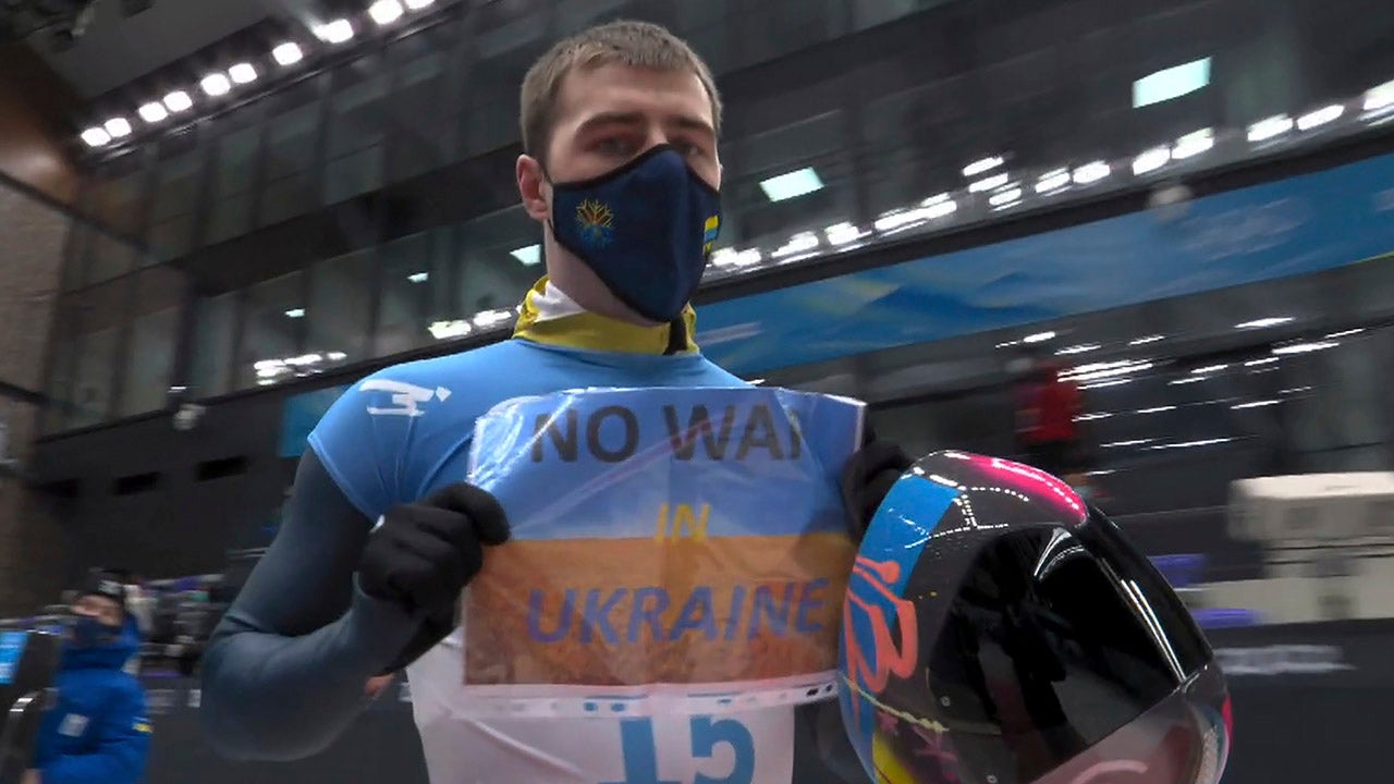 A Ukrainian skeleton athlete flashed a small sign that read "No War in Ukraine" to the cameras as he finished a run at the Beijing Olympics on Friday night.
