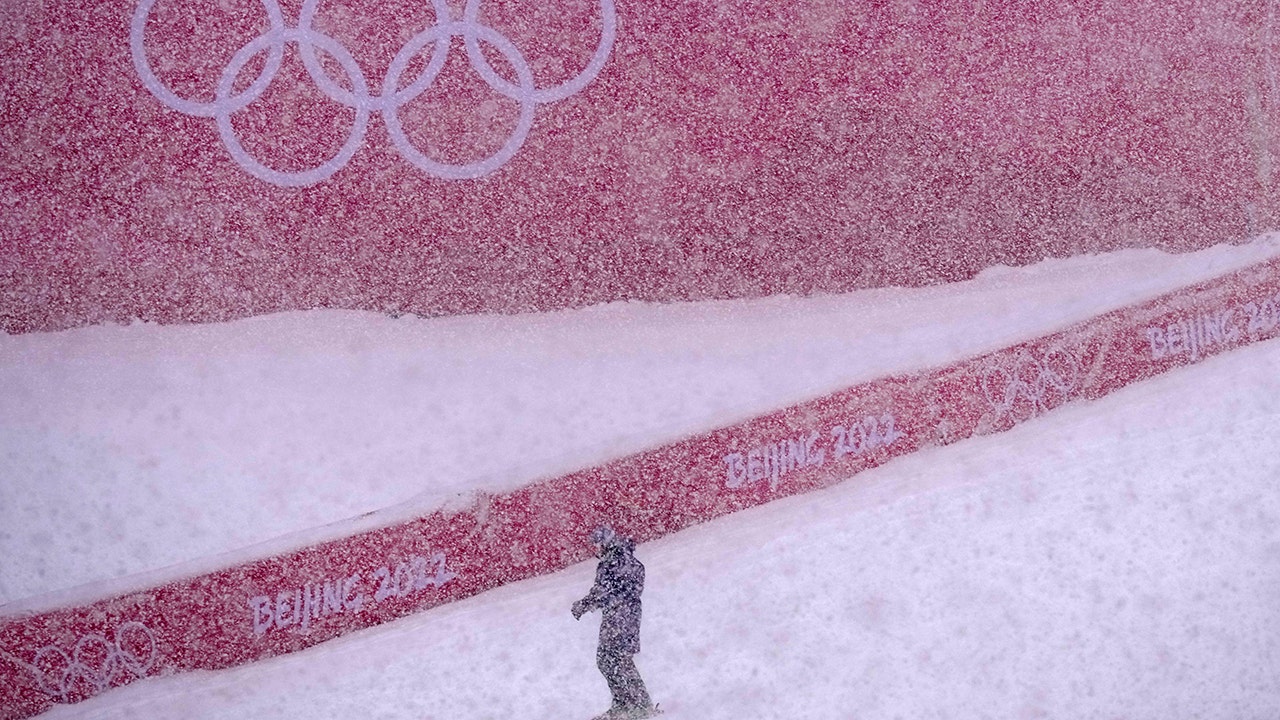 While a light snow fell Saturday, it came down a lot harder on Sunday, the first time it snowed during an Alpine race during the Beijing Olympics. The heavy snow forced the second run to be postponed by 1 hour, 15 minutes. During the delay, workers cleared snow from the course with snow blowers and shovels.