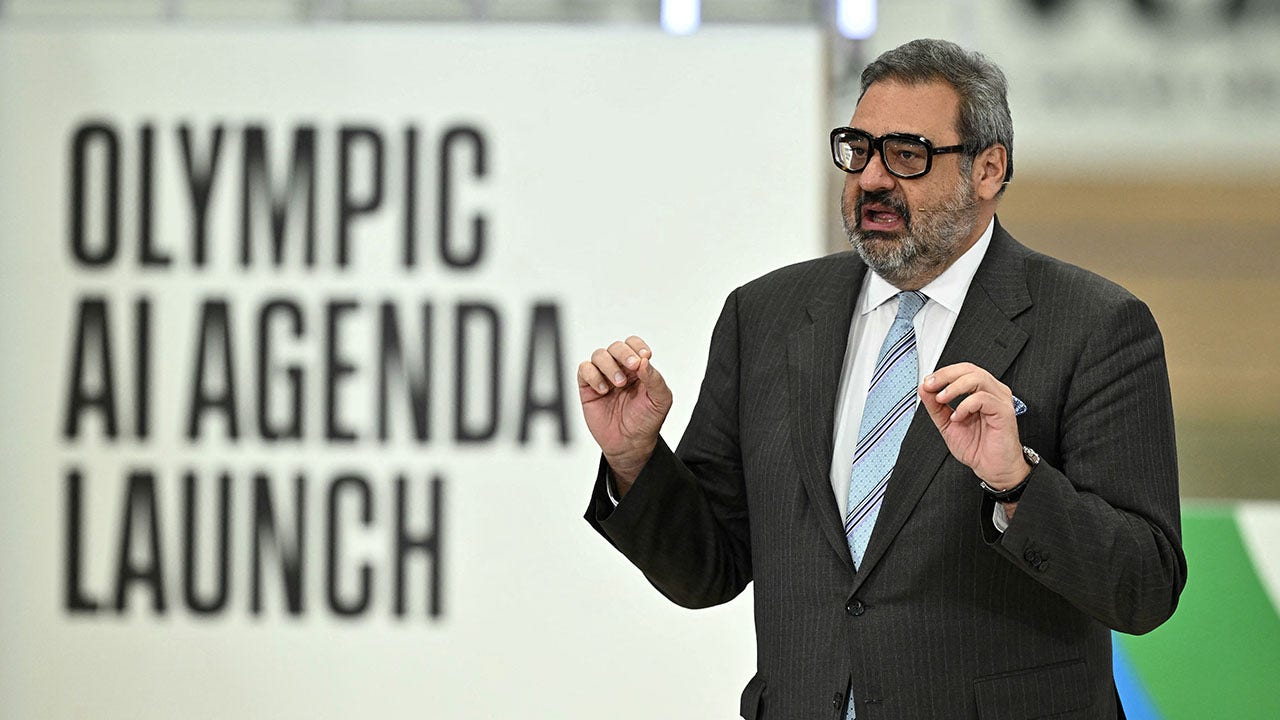 Chief Executive Officer for the Olympic Broadcasting Services at the IOC, Yiannis Exarchos, gestures as he speaks during the Olympic AI Agenda event at Lee Valley VeloPark in London on April 19, 2024. (BEN STANSALL/AFP via Getty Images)