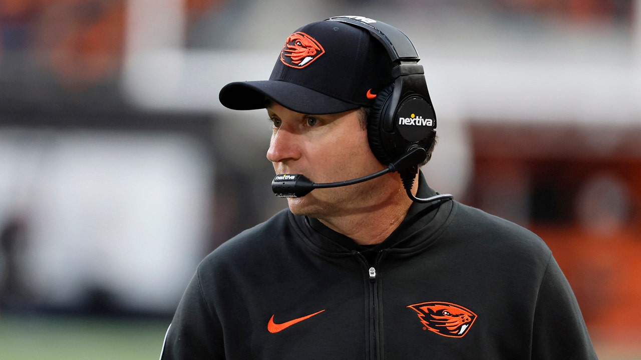 Head coach Jonathan Smith of the Oregon State Beavers on the field as his team warms up before the SRS Distribution Las Vegas Bowl against the Florida Gators at Allegiant Stadium Dec. 17, 2022, in Las Vegas. (David Becker/Getty Images)