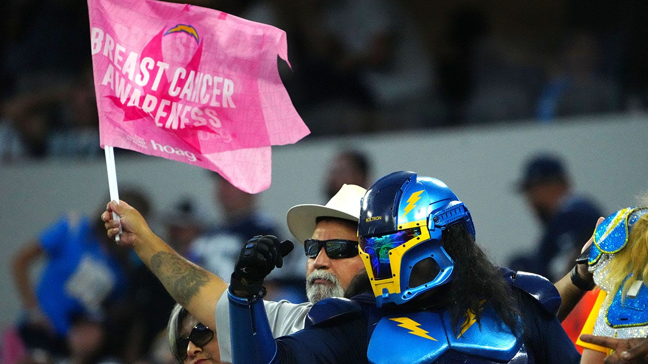 A fan waves a breast cancer awareness flag during the game between the Los Angeles Chargers and the Dallas Cowboys at SoFi Stadium on Oct. 16, 2023, in Inglewood, California. (Kirby Lee-USA Today Sports)