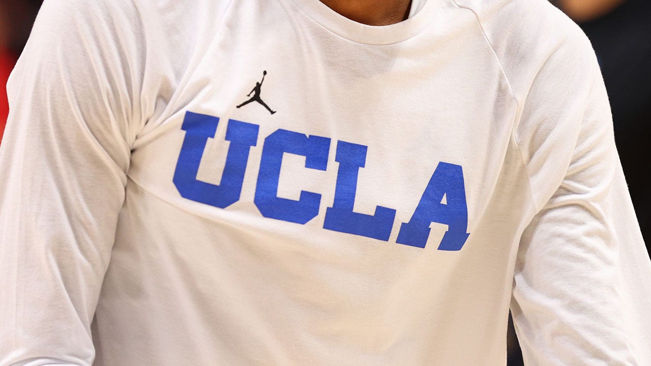 Peyton Watson, #23 of the UCLA Bruins, wears a shirt with the Jordan Jumpman logo before the UCLA Bruins take on the St. Mary's Gaels during the second round of the 2022 NCAA Men's Basketball Tournament held at the Moda Center on Mar. 19, 2022 in Portland, Oregon. (Photo by Jamie Schwaberow/NCAA Photos via Getty Images)