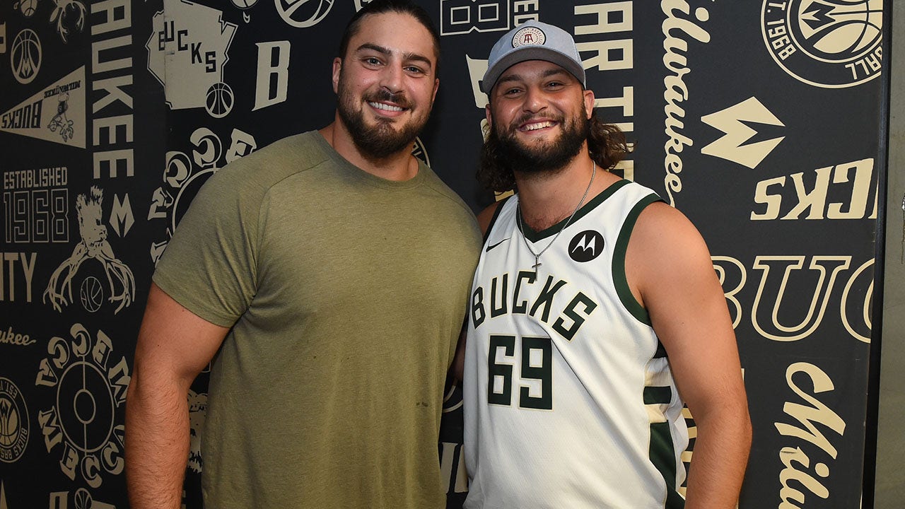 Green Bay Packers offensive lineman David Bakhtiari delighted Milwaukee Bucks fans on Sunday night with one of his patented beer chugs during a break in Game 3 against the Phoenix Suns.