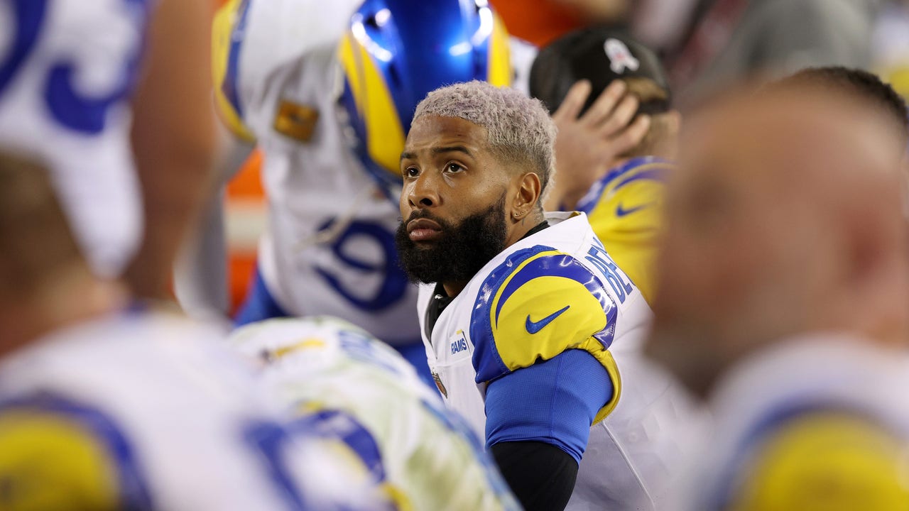Odell Beckham Jr. of the Los Angeles Rams sits on the bench during the game against the San Francisco 49ers at Levi's Stadium on Nov. 15, 2021 in Santa Clara, California. (Photo by Ezra Shaw/Getty Images)