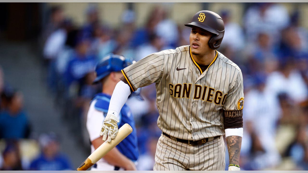 Manny Machado #13 of the San Diego Padres tosses his bat after a solo home run in the first inning in game two of the National League Division Series against the Los Angeles Dodgers at Dodger Stadium on October 12, 2022 in Los Angeles, California. (Ronald Martinez/Getty Images)