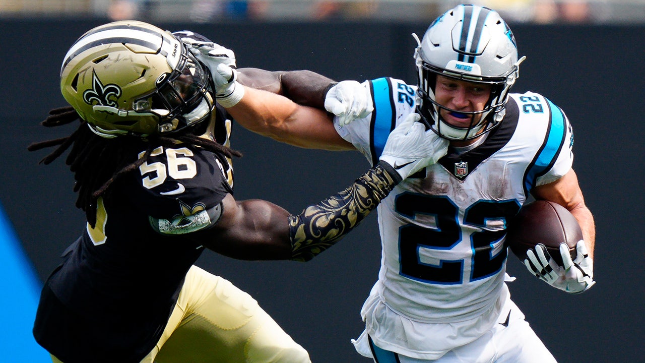 Carolina Panthers running back Christian McCaffrey pushes away from New Orleans Saints outside linebacker Demario Davis during the second half of an NFL football game Sunday, Sept. 19, 2021, in Charlotte, N.C. ((AP Photo/Jacob Kupferman))