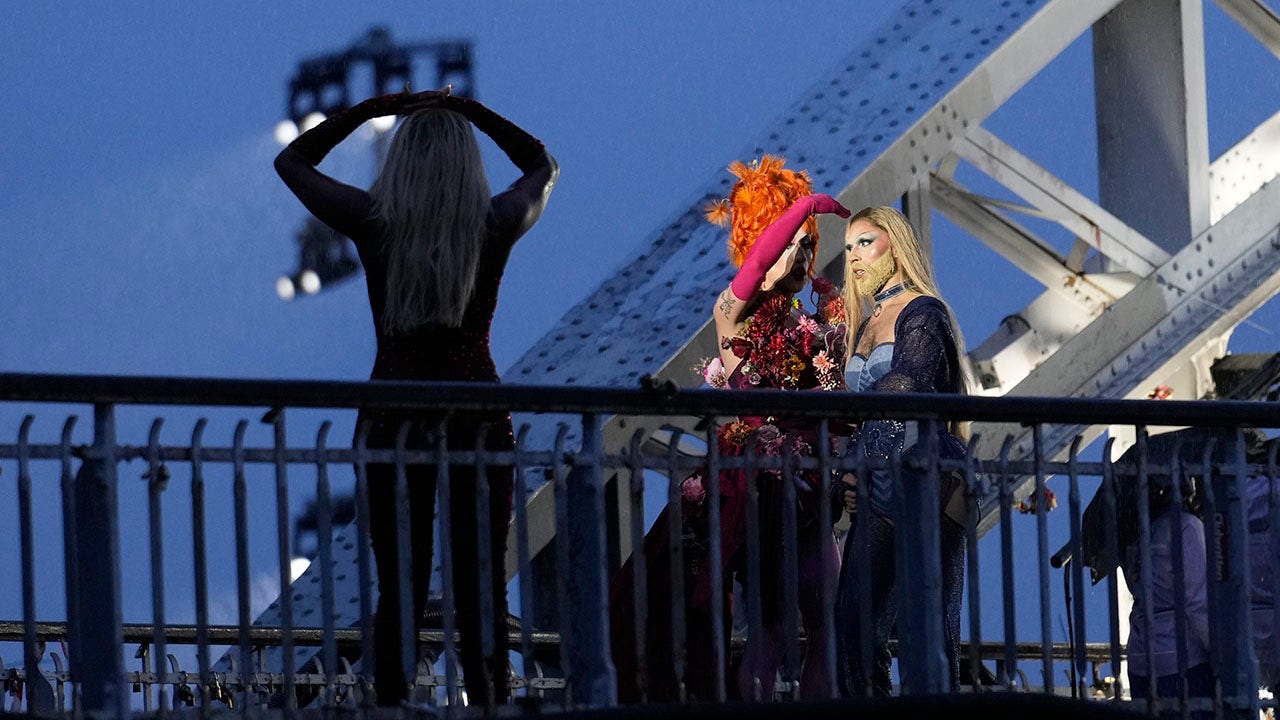 Drag queen Piche prepares to perform at the Debilly Bridge in Paris, during the opening ceremony of the Summer Olympics, Friday, July 26, 2024. (AP Photo/Tsvangirayi Mukwazhi)