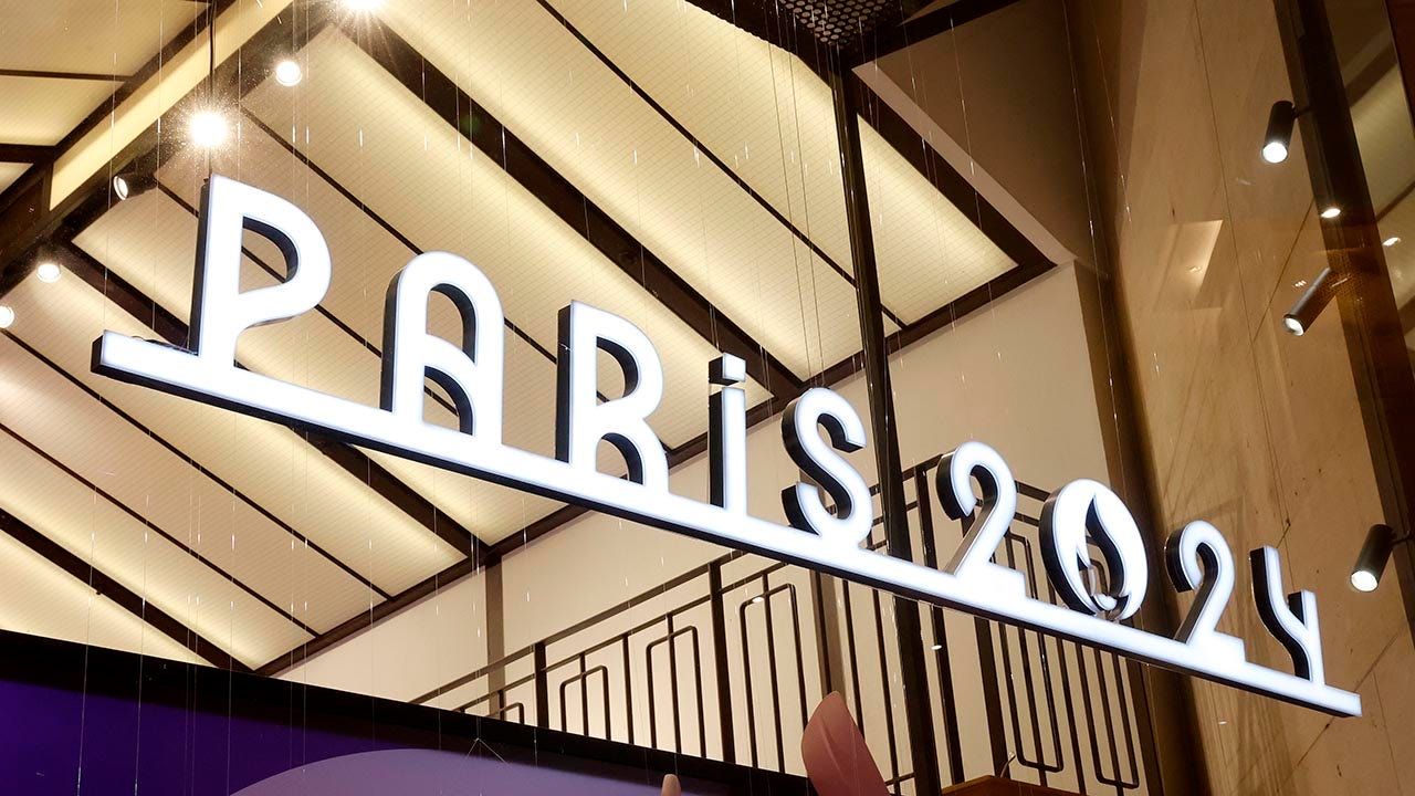 The logo, Paris 2024, representing the Olympic Games, is displayed on the facade of an official store on Feb. 21, 2024 in Paris. (Chesnot/Getty Images)