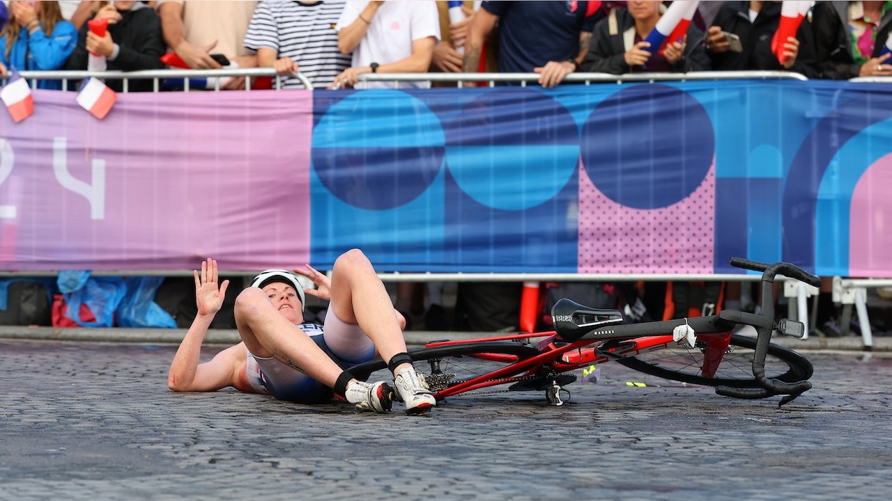 The cycling leg of the women's triathlon at the Paris Olympics descended into a flury of bicycle crashes on Wednesday as competitors slipped across wet cobblestone.
