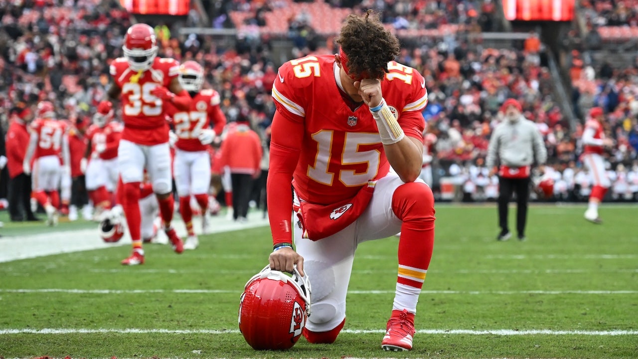 Patrick Mahomes of the Kansas City Chiefs kneels in prayer before a game against the Cleveland Browns at Huntington Bank Field Dec. 15, 2024, in Cleveland. (Nick Cammett/Diamond Images via Getty Images)