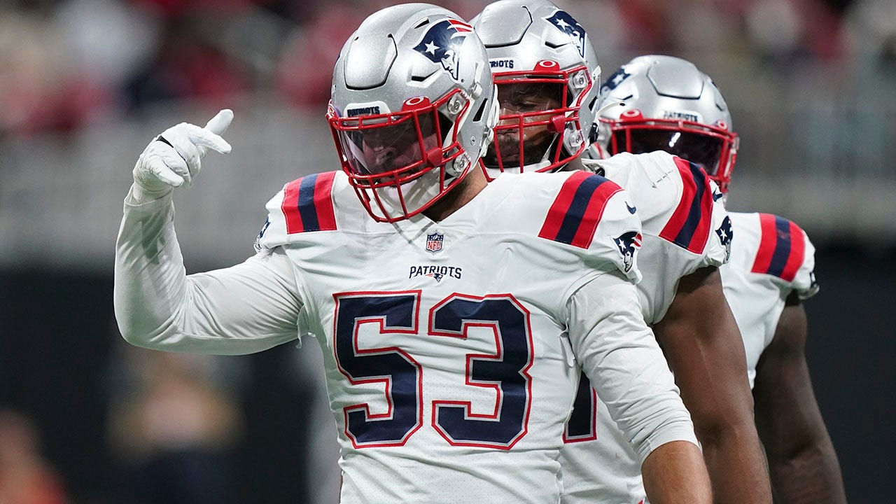 New England Patriots middle linebacker Kyle Van Noy (53) celebrates tackling Atlanta Falcons quarterback Matt Ryan during the first half of an NFL football game, Thursday, Nov. 18, 2021, in Atlanta. (AP Photo/Brynn Anderson)