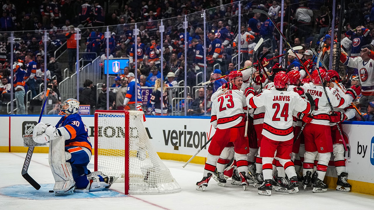 The Carolina Hurricanes celebrate after defeating the New York Islanders in overtime in Game Six of the First Round of the 2023 Stanley Cup Playoffs at UBS Arena on April 28, 2023 in Elmont, New York. The Carolina Hurricanes defeated the New York Islanders in the series 4-2. (Josh Lavallee/NHLI via Getty Images)