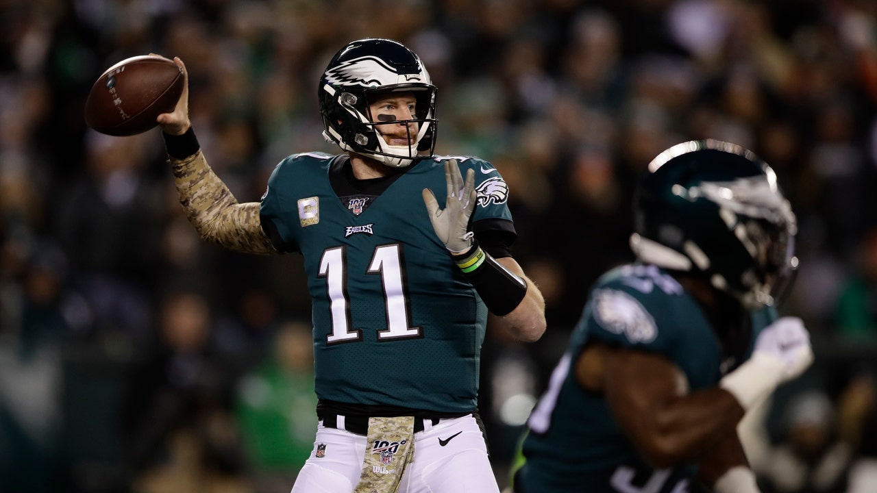 Philadelphia Eagles' Carson Wentz looks to pass during the first half of an NFL football game against the New England Patriots, Sunday, Nov. 17, 2019, in Philadelphia. (AP Photo/Matt Rourke)