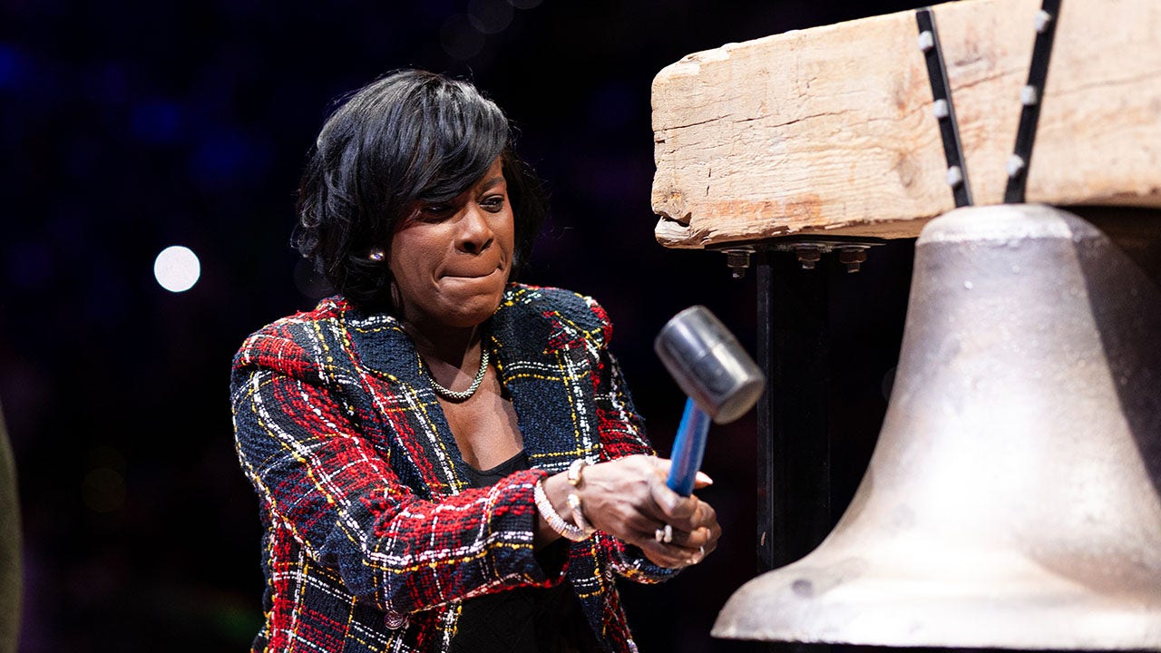 Mayor Cherelle Parker rings the ceremonial bell before the action between the 76ers and the Houston Rockets at Wells Fargo Center in Philadelphia on Jan. 15, 2024. (Bill Streicher-USA Today Sports)