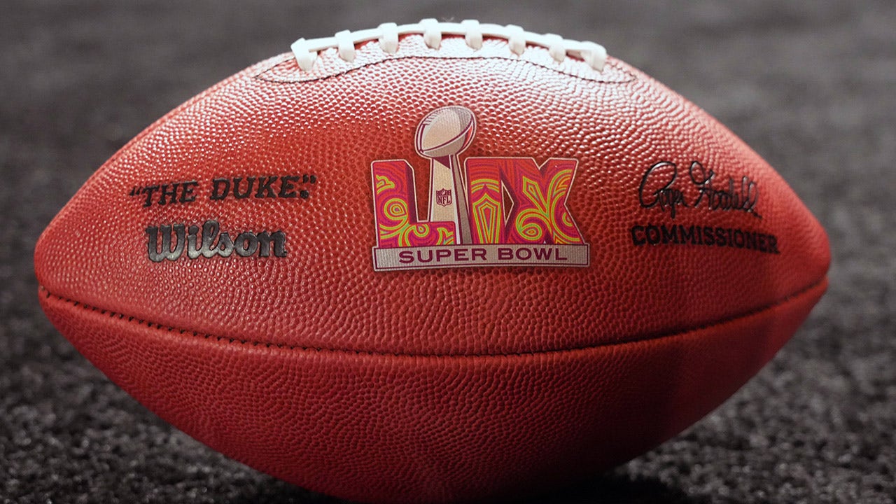A Wilson football with the Super Bowl logo at the Super Bowl Host Committee Handoff press conference at the Super Bowl LVIII media center at the Mandalay Bay North Convention Center in Las Vegas Feb. 12, 2024. (Kirby Lee/USA Today Sports)