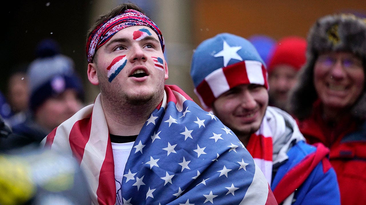 A man is draped in the United States flag as a group of U.S. men's national soccer team supporters march to Lower.com Field ahead of a FIFA World Cup qualifying soccer match against El Salvador, Thursday, Jan. 27, 2022, in Columbus, Ohio. (AP Photo/Julio Cortez)