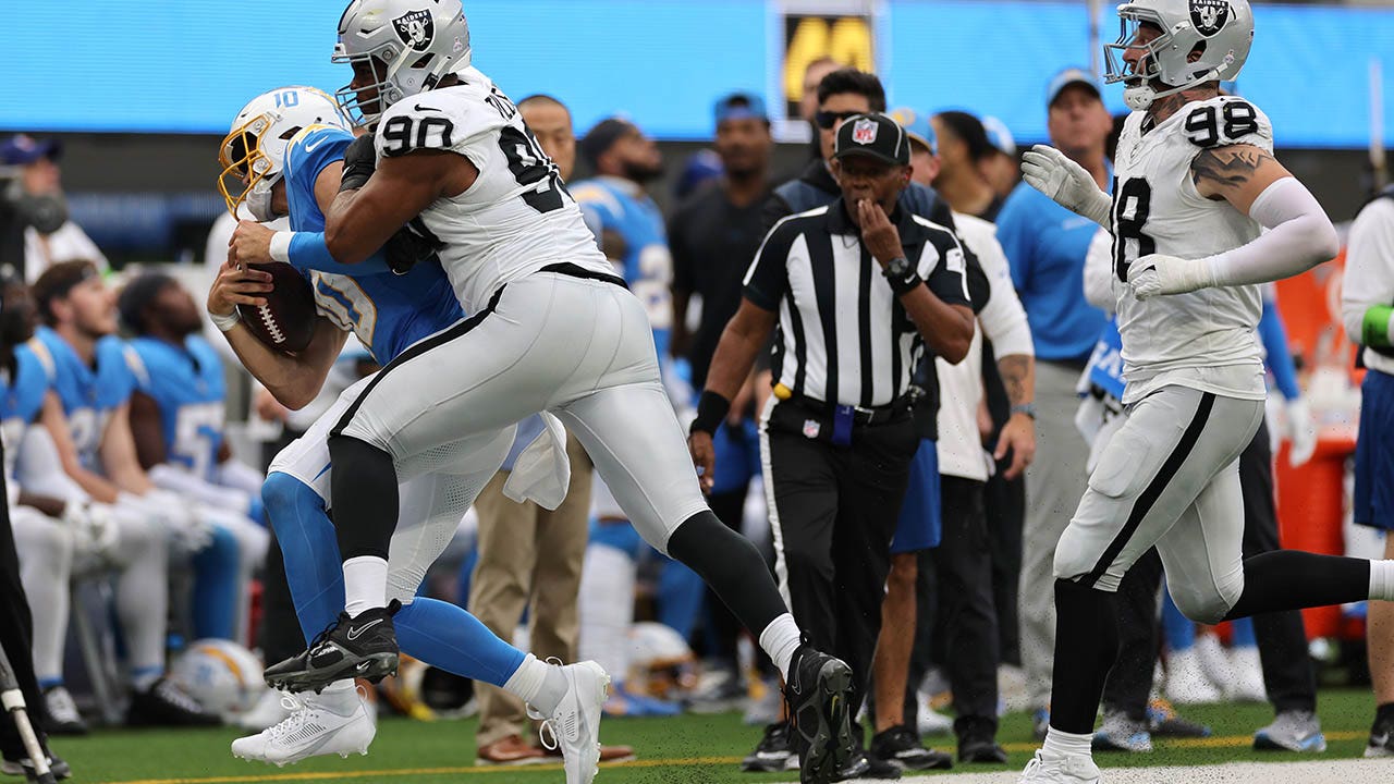 Las Vegas Raiders defensive lineman Jerry Tillery was disqualified from Sunday’s game against the Los Angeles Chargers after he delivered a hit on quarterback Justin Herbert out-of-bounds.