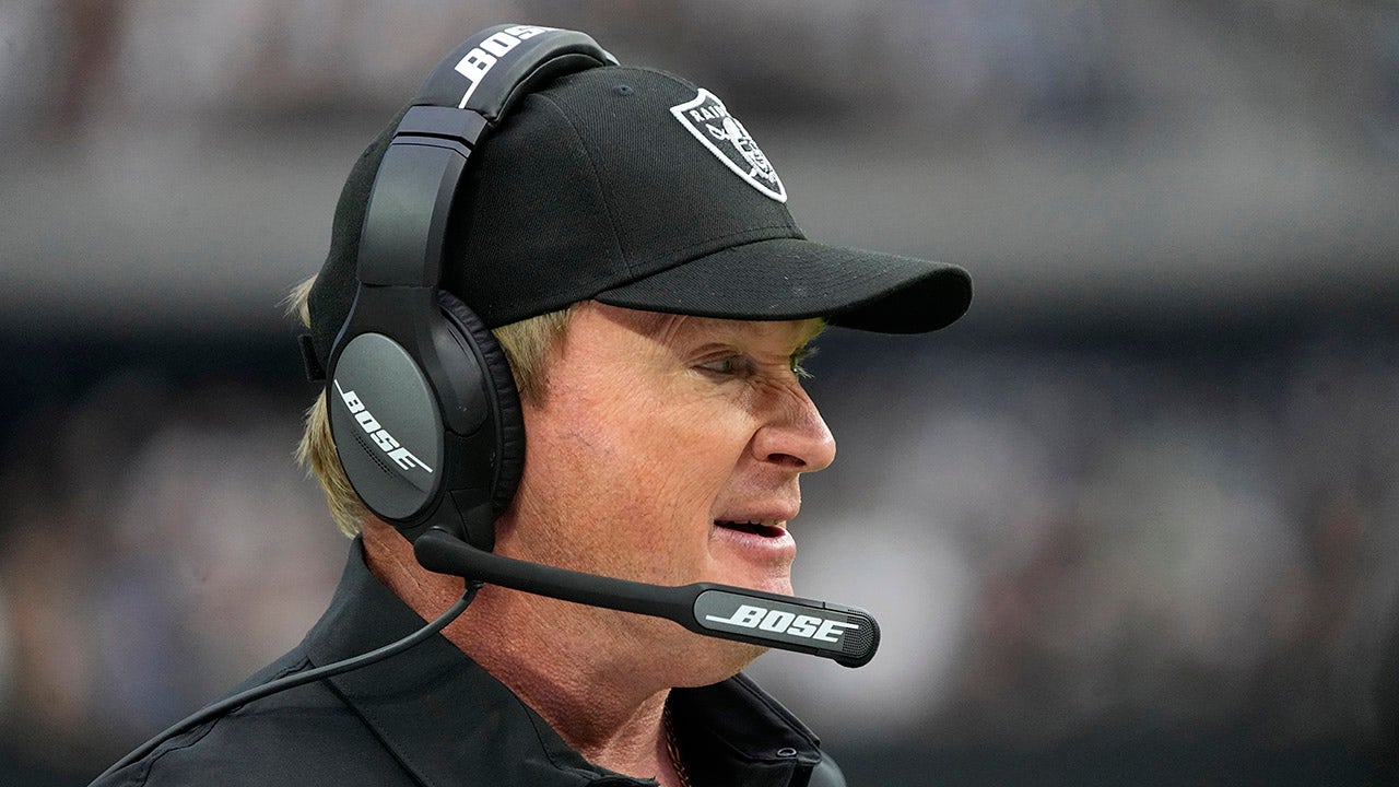 Las Vegas Raiders head coach Jon Gruden stands on the sidelines during the first half of an NFL football game against the Miami Dolphins, Sunday, Sept. 26, 2021, in Las Vegas. (AP Photo/Rick Scuteri)