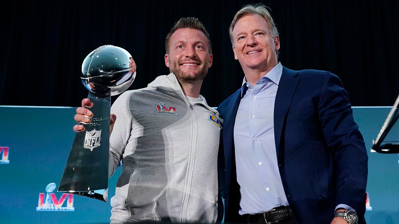 CORRECTS SPELLING TO LOMBARDI, NOT LOMBARDY AS ORIGINALLY SENT - Los Angeles Rams head coach Sean McVay, left, holds the Vince Lombardi trophy during a press conference while posing for photos with league commissioner Roger Goodell following the NFL football team's Super Bowl win over the Cincinnati Bengals Monday, Feb. 14, 2022, in Los Angeles. (AP Photo/Marcio Jose Sanchez)