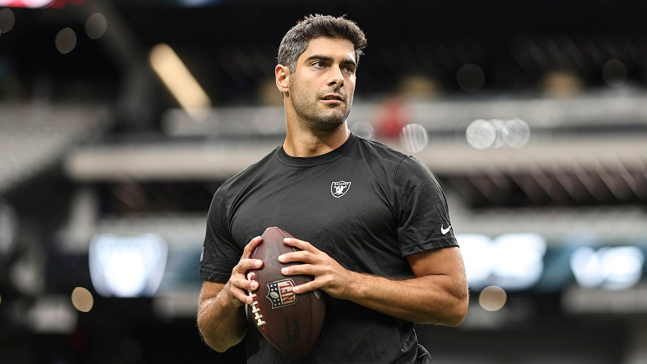 Jimmy Garoppolo of the Las Vegas Raiders warms up prior to a game against the San Francisco 49ers at Allegiant Stadium Aug. 13, 2023, in Las Vegas. (Michael Owens/Getty Images)