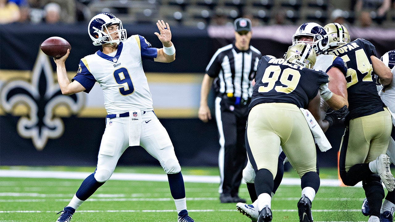 Luis Perez #9 of the Los Angeles Rams throws a pass during a game against the New Orleans Saints at Mercedes-Benz Superdome during week 4 of the preseason on August 30, 2018 in New Orleans, Louisiana. The Saints defeated the Rams 28-0. (Photo by Wesley Hitt/Getty Images)