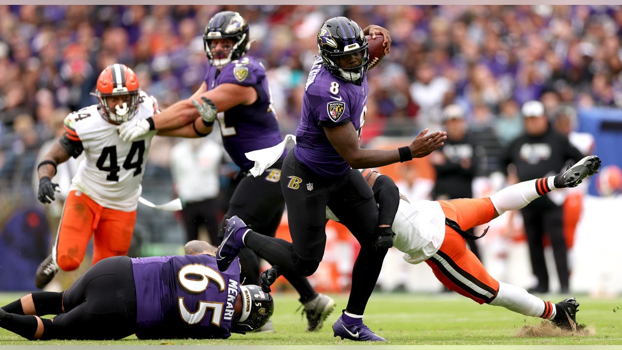 Lamar Jackson #8 of the Baltimore Ravens avoids being tackled during the second half of the game against the Cleveland Browns at M&T Bank Stadium on October 23, 2022, in Baltimore, Maryland. (Patrick Smith/Getty Images)