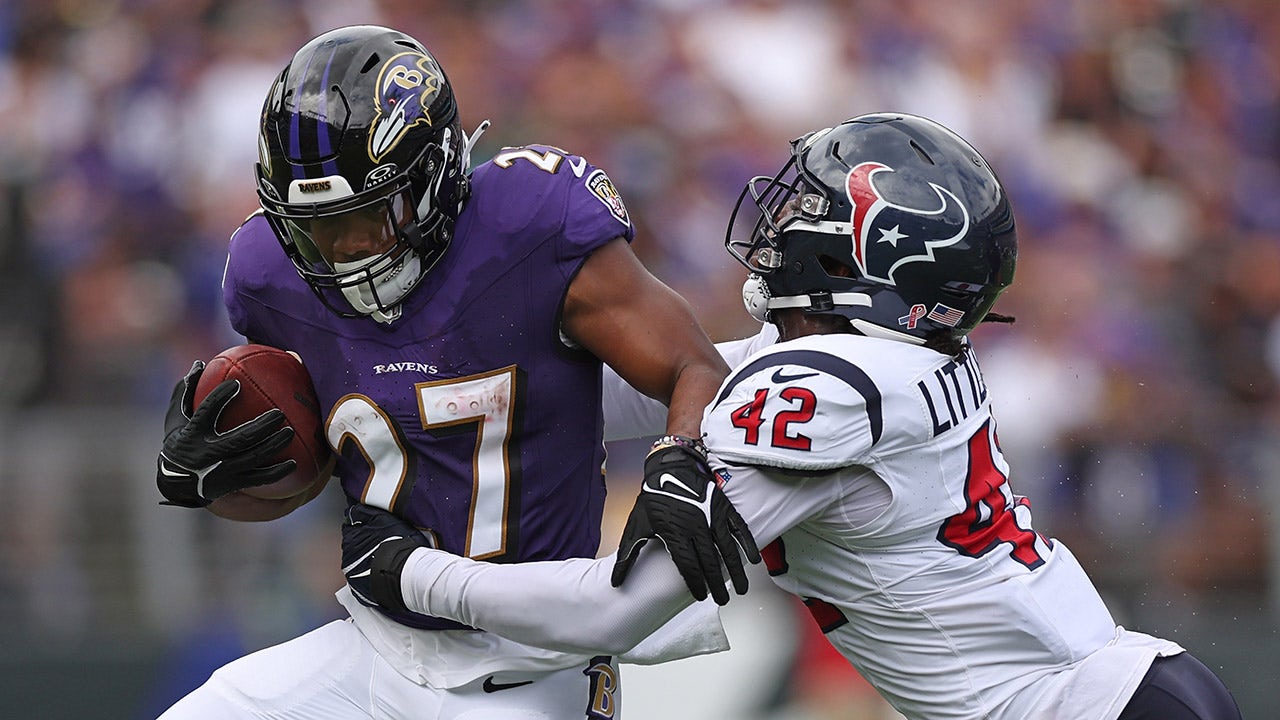 J.K. Dobbins (27) of the Baltimore Ravens is wrapped up by Cory Littleton (42) of the Houston Texans during the first half at M&T Bank Stadium Sept. 10, 2023, in Baltimore. (Patrick Smith/Getty Images)