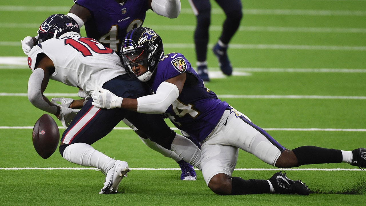 Baltimore Ravens cornerback Marlon Humphrey (44) causes Houston Texans wide receiver Keke Coutee (16) to fumble during the first half of an NFL football game Sunday, Sept. 20, 2020, in Houston. Baltimore recovered and scored a touchdown on the play. (AP Photo/Eric Christian Smith)
