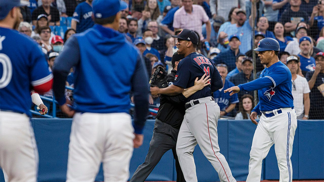 Boston Red Sox third baseman Rafael Devers (11) is held back by an umpire during a heated exchange after Toronto Blue Jays' Alejandro Kirk was hit by a pitch during the fourth inning of a baseball game Wednesday, June 29, 2022, in Toronto. (Christopher Katsarov/The Canadian Press via AP)
