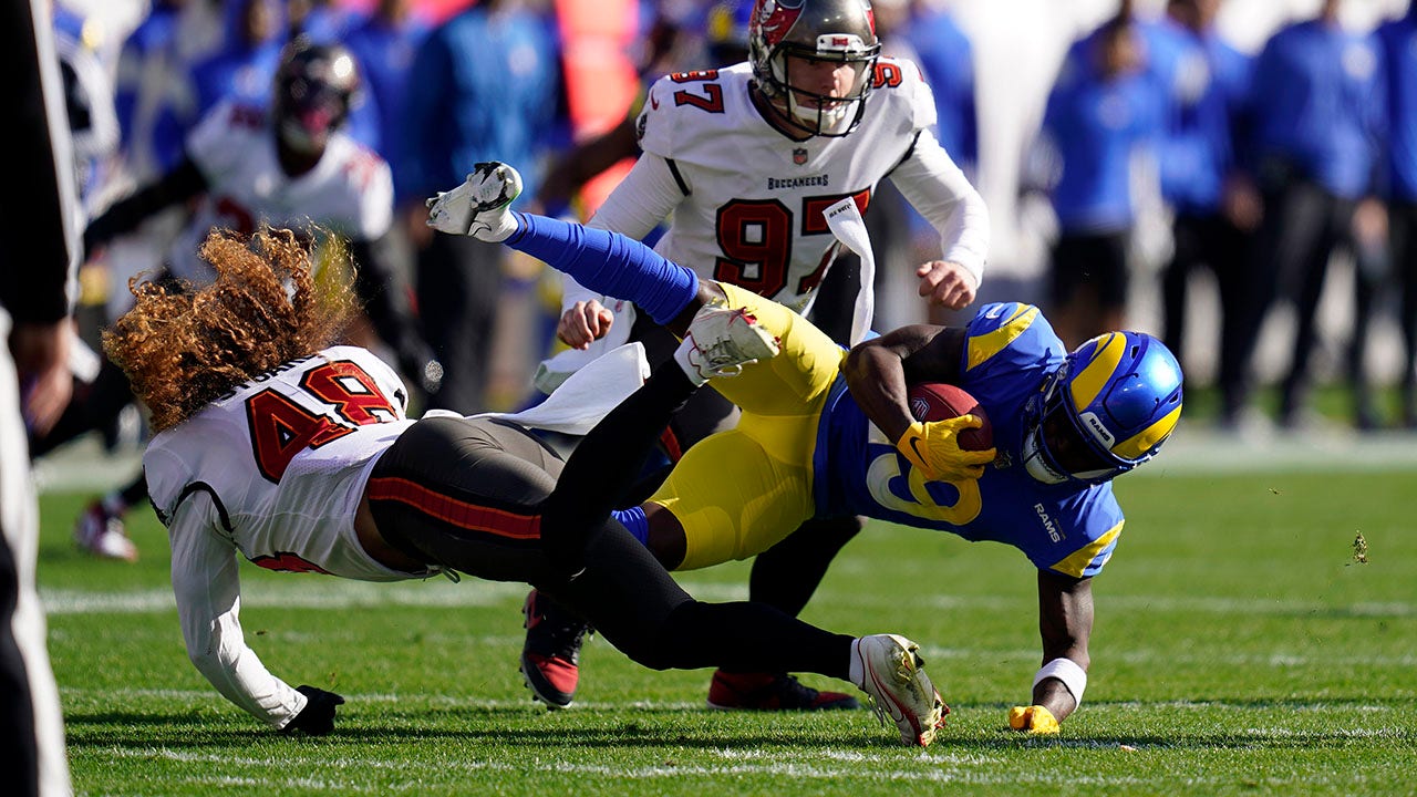 Tampa Bay Buccaneers linebacker Grant Stuard (48) upendes Los Angeles Rams wide receiver Brandon Powell (19) during the first half of an NFL divisional round playoff football game Sunday, Jan. 23, 2022, in Tampa, Fla. (AP Photo/John Raoux)