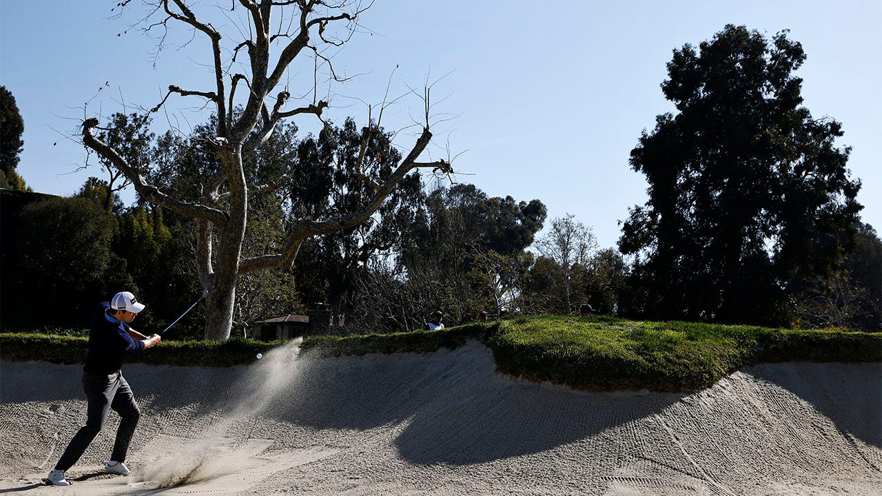 Patrick Cantlay of the United States plays his shot from a bunker on the 16th hole during the final round of the Genesis Invitational at Riviera Country Club on February 19, 2023 in Pacific Palisades, California. (Michael Owens/Getty Images)