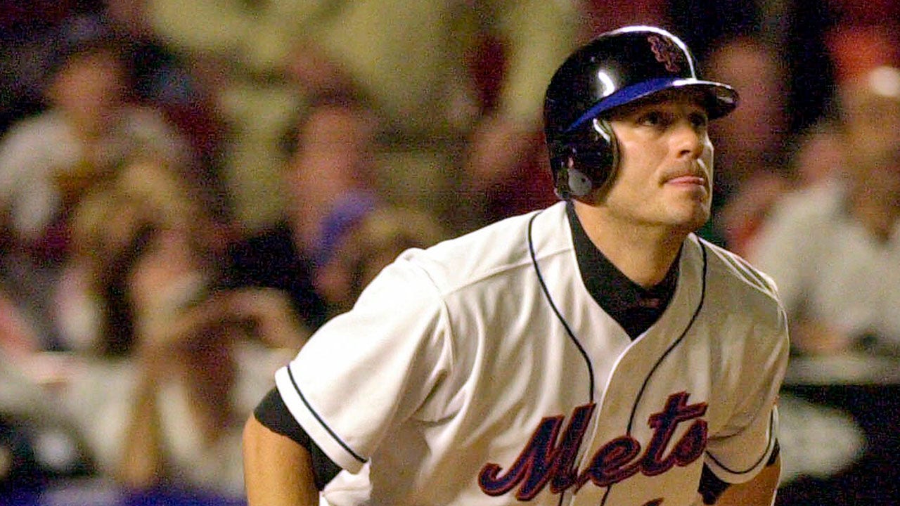 FILE - New York Mets Robin Ventura watches the path of his grand slam hit off Houston Astros pitcher Jay Powell in the seventh inning of a baseball game on May 1, 2001, at Shea Stadium in New York. The Mets announced Tuesday, Feb. 8, 2022, the return of Old-Timers Day for the first time since 1994. (AP Photo/Kathy Willens, File)