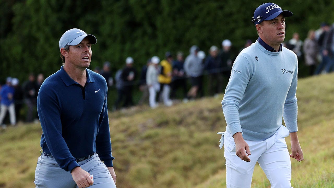 Rory McIlroy of Northern Ireland, left, and Justin Thomas of the United States walk across the 18th hole during the first round of The Genesis Invitational at Riviera Country Club Feb. 16, 2023, in Pacific Palisades, Calif. (Harry How/Getty Images)