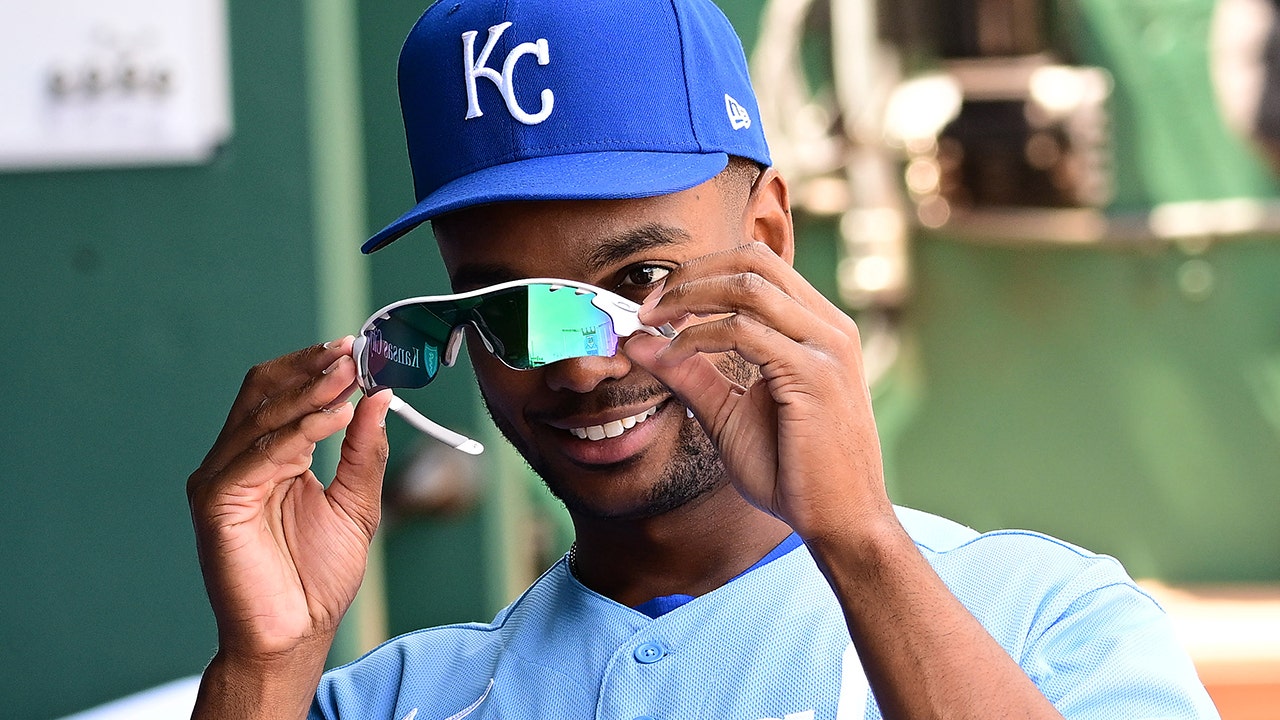Kansas City Royals center fielder Michael Taylor (2) checks over his sunglasses before a MLB game between the Minnesota Twins and the Kansas City Royals on April 21, 2022, at Kauffman Stadium, Kansas City, MO. (Keith Gillett/Icon Sportswire via Getty Images)