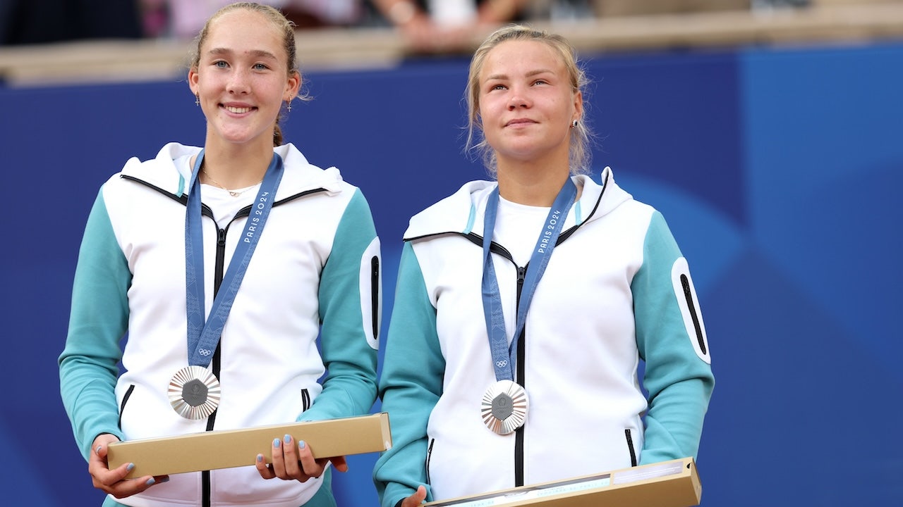 Silver Medallists Mirra Andreeva and Diana Shnaider of Team Individual Neutral Athletes pose on the podium during the Tennis Women's Doubles medal ceremony after the Tennis Women's Doubles Gold medal match. (Clive Brunskill/Getty Images)