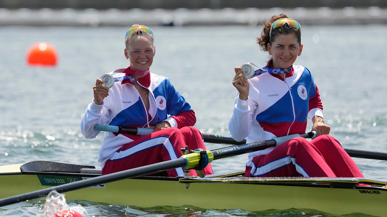 Vasilisa Stepanova and Elena Oriabinskaia of the Russian Olympic Committee pose with their silver medals after the women's rowing pair final at the 2020 Summer Olympics, Thursday, July 29, 2021, in Tokyo, Japan. (AP Photo/Lee Jin-man)