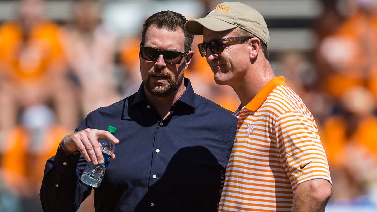 Peyton Manning and Ryan Leaf talk before a game between the Tennessee Volunteers and Georgia State Panthers Aug. 31, 2019, at Neyland Stadium in Knoxville, Tenn. (Bryan Lynn/Icon Sportswire via Getty Images)