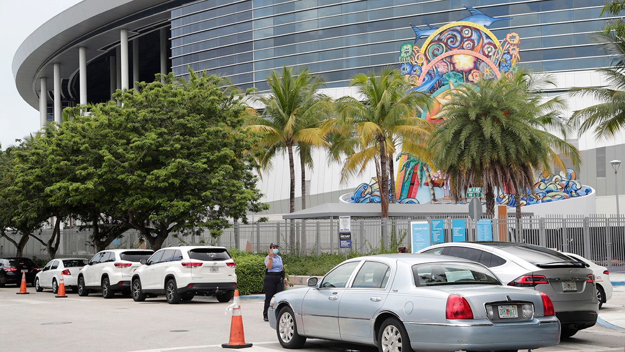 Long lines of cars at the virus testing site at the Marlins' ballpark provide the team with a daily reminder of the hazards off the field.
