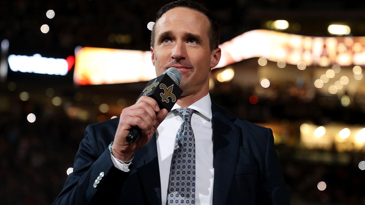 Former Saints quarterback Drew Brees speaks to the fans during halftime of the game between the Buffalo Bills and the Saints at Caesars Superdome on Nov. 25, 2021, in New Orleans, Louisiana. (Chris Graythen/Getty Images)